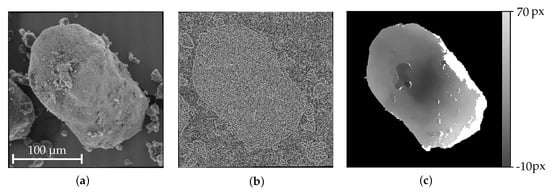To determine a disparity map that contains the information about the horizontal parallax of corresponding pixels between the stereo-pair images, a dense matching algorithm is used. There are various approaches to solve the dense stereo matching problem. In this work, the famous Semi-Global Block Matching (SGBM) approach was chosen that provides a good trade-off between accuracy and computation time []. To compensate occuring radiometric distortions and improve the matching quality in the area of depth discontinuities, a rank filter is applied to the images that replaces the intensity values with the number of pixels which intensities are below the center pixel’s intensity for a certain neighbourhood []. The utilized SGBM implementation combines the pixelwise, local Birchfield-Tomasi Subpixel Metric [] that computes the absolute distance between the extrema of linear interpolations of the corresponding pixels of interest with their neighbors and a global smoothness constraint that is approximated by computing eight symmetrical, one-dimensional pathwise optimizations for each pixel of the disparity map and summing their costs. Finally, for every pixel the disparity is chosen that has the lowest sum of aggregated costs. Low quality matches are discarded when the uniqueness defined as the ratio of the best two costs for different disparity values is too similar. Further outliers are identified by a left-right consistency check, switching the image of the stereo-pair in that is searched for the corresponding pixel. If the obtained difference of the two disparity values for every pixel surpasses a chosen threshold, none of the values is assigned to the related pixel. These post-processing steps ensure that occlusions and invalid matches do not falsify the final result. For optimal performance, the underlying thresholds are individually adjusted based on the imaged structures. In Figure 8, the SEM image, its rank transformed form and the obtained disparity map from the related stereo-pair are illustrated. To segment the specimen that functions as the region of interest for this reconstruction routine, a graph cuts based image segmentation approach [] is used to only reconstruct the desired parts of the images.