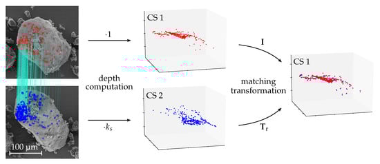 The obtained disparity map allows to identify the corresponding pixels in the rectified images. Subsequently, the coordinates of these point matches are transformed back to the original image’s coordinate system applying the inverse rectifying transformations. In addition, the image points are centered at the origin of their local coordinate system to eliminate the translational vector describing the camera’s position. The metric scaling factor that was initially determined for the untilted stage setting using a multiscale checkerboard pattern, is applied to the point coordinates to transform the pixel values to metric ones. For images of SEMs, this factor is directly proportional to the selected magnification setting as long as the working distance and stage height are not altered. With the before recovered intrinsic and extrinsic parameters, the inhomogenious triangulation method [] is used to solve for the 3D coordinates in the world coordinate system that coincides with the first frame’s coordinate system of the sequence.