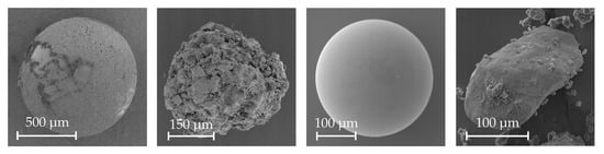 Images of the specimen that were used for the evaluation process. From left to right: Chalked Sphere (mag. 60, 2000 × 2000 px), Gravel Particle (mag. 150, 1000 × 1000 px), 300 µm Sphere (mag. 200, 2000 × 2000 px), DEP agglomerate (mag. 400, 2000 × 2000 px).