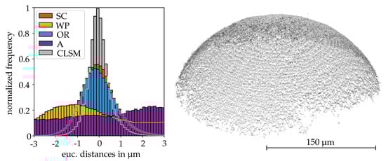 First, the results for the 300 µm reference sphere are presented to classify the accuracy of the CLSM measurements and SEM reconstructions. In Figure 11, the deviations from the measurements to the spherical LSQ fit are illustrated in form of a histogram. It can be noticed that the data provided by the CLSM comes closest to the given manufacturer specifications and yields the smallest RMSE for the distances to the spherical LSQ fit which is given along with the RMSEs for the factorization methods, their recovered intrinsic parameters and the radii of the spherical LSQ fits in Table 2. For the reconstruction routine, the scaled orthographic factorization method obtained the most precise result, closely followed by the orthographic factorization method. The methods based on the non-linear minimization of a cost function produce distorted results which are mainly caused by the wrong estimation of the one-axial scaling factor c and the skew factor s. It is demonstrated in Table 3, that the adjustment of and , after the computation of the extrinsic and intrinsic parameters using the weak perspective and general affine cost functions, results in a better overall reconstruction result although for the weak perspective camera, turns out to be too high. The radii for the CLSM measurement and the scaled orthographic factorization method lie in the tolerances of the manufacturer’s specifications. On the contrary, the orthographic factorization results in a that is too small. The recovered rotation angles are given exemplarily in Table 3 for the manually carried out stage motion with tilt angle changes of approximately between the stage’s positions. In the following, the illustrations of the C2C distances are limited to the results that allow a meaningful registration with the CLSM measurements. An overview of the estimated parameters for the different methods is given in Table 4 so that the reasons for distorted reconstructions can be identified.