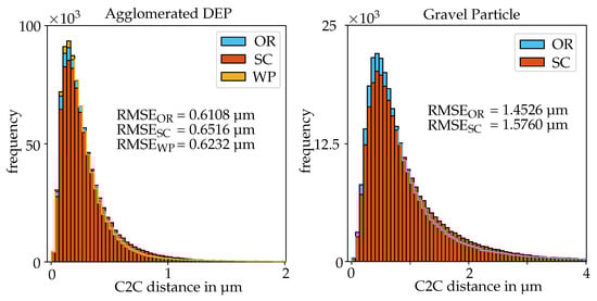 C2C distances between the aligned SEM reconstructions and confocal laser scanning microscope (CLSM) measurements for the respective factorization method regarding the sequences of the DEP agglomerate (1344742 points) and Gravel Particle (327997 points).