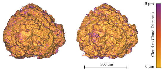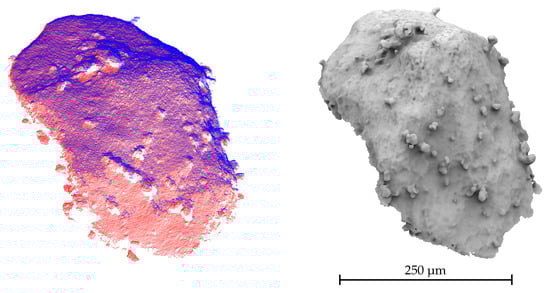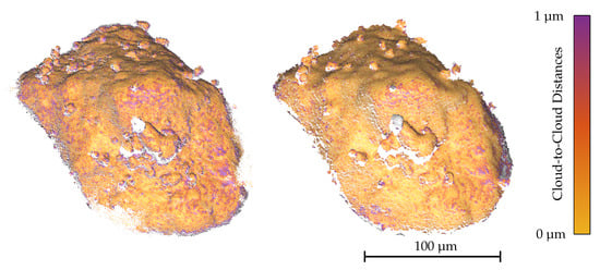 In Figure 17, the two registered and merged point clouds are illustrated. The images which function as the triangulation basis were selected for the stage’s rotation angles of = (, ) and = (, ) utilizing the full tilt motion of the available SEM stage. The additional views provide more data about the sloping surface parts so that the DEP agglomerate’s top surface can be completely reconstructed. As connection images, the views with the angle settings of and were selected, in total a tilt angle difference of . Due to the use of ASIFT, the number of valid correspondences between the connection images is increased from 177 to 437 so that the initial aligning transform can be robustly determined. Based on an estimated overlap of 80%, the Trimmed ICP algorithm is applied in the same manner as used for the comparison of the CLSM and SEM data. The final registration error for the 80% considered points of the dense point clouds was 0.7212 µm. This value is slightly reduced by adjusting the scale in the initial alignment with the computed for the connection images to 0.7205 µm. The aligned point clouds were further merged and a mesh was created using a Poisson Surface Reconstruction []. For each sequence, three images and the orthographic factorization method were used. Even though the impact of the scale adjustment is rather small in this scenario, it is more likely that an impact on the scaling between images with strong view alterations can appear. Due to the perspective change, different features of the surface have to be focussed and the depth profile will change. Furthermore, the image acquisition could still be extended to capture additional image sequences for differently rotated stage positions or larger view alterations.