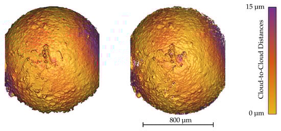 A final view on the details of the reconstructed surface of the Chalked Sphere in Figure 16 reveals the common limitations of photogrammetric approaches, solving the correspondence problem in smooth areas. The blank spots of the spherical surface cause some noise in the reconstructed point cloud and some minor surface details get lost. Nevertheless, major characteristics of the surface coincide in both measurements. The highest visible deviations are present on the right and left sides of the sphere. Adjusting the scale of the reconstructed sphere could not improve the result so that there is probably a small curvature mismatch. On the one hand, this could be caused by distortions of the scan pattern that can occur in the very low magnification range []. On the other hand, the presence of perspective effects may impair the factorization methods and lead to falsified reconstruction results.