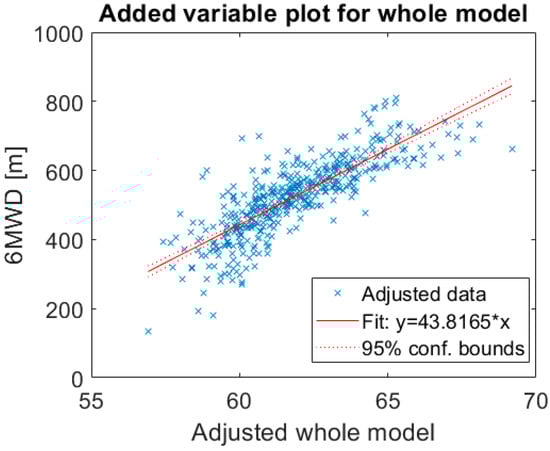Linear regression analysis was performed using stepwise variable selection procedures to identify the best predictors of exercise capacity measured during a standardized 6MWT. Anthropometric, ECG- and accelerometer-derived features were included as independent variables in the model with 6MWD as outcome measure. Non-predictors were removed to obtain a simpler model with fewer predictors while a similar predictive accuracy was maintained. Chronotropic response and effort were found to be the most significant predictors of 6MWD. The determination coefficient R2 of the model was 0.661, which indicates that the 6MWD can be reasonably determined by the chronotropic response and effort measured during the 6MWT. In other words, by using these two predictor variables 66% of variation in the 6MWD can be defined, the RMSE was 64.8 m. The overall model prediction is presented as an adjusted variable plot to visualize the fit of the independent variables, chronotropic response and effort, versus the dependent variable 6MWD (Figure 1).