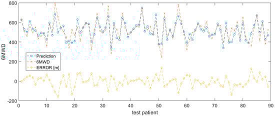 The model performance was evaluated with random sampling by running 20-fold-validation. The patient data was split into a training and validation set with a splitting percentage of 80% train—20% validation. No significant difference was observed. Figure 2 shows the results of the 6MWD prediction for 20% of the patients in the validation set for a single random split (n = 18 patients, accounting for 89 6MWTs in total). The prediction curve (blue) approaches the trend of the actual 6MWD data (red), indicating a good performance of the SVM predictor, using only chronotropic response and accelerometer-derived effort as input features. With the exception of some 6MWT measurement sessions, the error on the 6MWD prediction is kept within reasonable ranges (yellow).