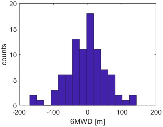 Error distribution in 6MWD prediction. Mean average error is equal to 42.5 m (±35.5 m).