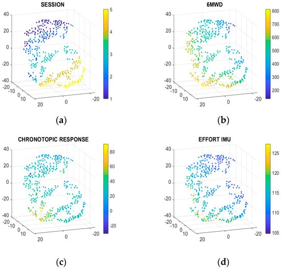 (a) t-distributed stochastic neighboring embedding (t-SNE) projection, colors represent rehabilitation time (session number) (upper left graph); (b) t-SNE projection, colors represent distance. Note that distance has not been used as input feature in the model, but it has only been used to color the map (upper right graph); (c) t-SNE projection, colors represent chronotropic response (bottom left graph); (d) t-SNE projection, colors represent effort during the last 2 min of the 6MWT (bottom right graph). The axes do not represent distance or time but are the results of a composite projection of features in a 3D space.
