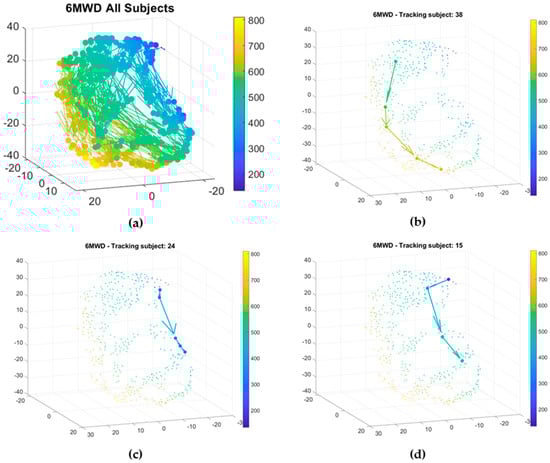 Figure 5a shows the rehabilitation trajectories for all subjects, color-coded by the 6MWD. The patients improve in functional capacity throughout the CR program, as visible by the increase in 6MWD and thus change in color. All patients will move from the upper to the lower part in space. Subjects who show a large improvement throughout CR are characterized by a change in color-coding (blue to yellow). Each patient is characterized by a unique trajectory. Figure 5b shows the trajectory of a patient who increases more than 100 m in 6MWD throughout CR. According to the subgroups present in Figure 4b,c, this patient can be characterized by an increase in chronotropic response and effort throughout CR, suggesting that the patient’s heart responds better to exercise at the end of CR compared to the start. Patient number 24 shows a small increase in 6MWD throughout CR (Figure 5c). The patient’s chronotropic response and effort remain low. The lack in improvement can be caused by the inability of the heart to adapt to exercise, as seen in the low chronotropic response values. Figure 5d shows the trajectory of patient number 15 throughout the CR program. Initially, an increase in 6MWD is seen between baseline and the second 6MWT, but the improvement stabilizes during the following measurements. Again, this patient is characterized by a low chronotropic response and effort value throughout CR. For these specific patients, a lower response to CR, represented by a low increase in distance walked throughout the program, is characterized by a lower chronotropic response and lower effort.