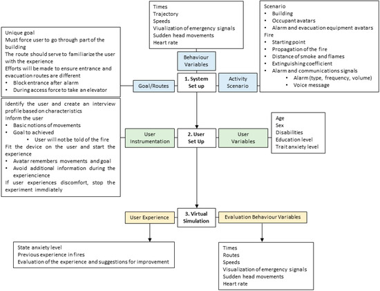 The analysis of the data can help design buildings, fire protection systems and evacuation procedures, with the goal of minimizing harm to people in the event of a fire. Behavioral analysis is also suitable for training emergency response teams and for the specific analysis of audio–visual alarms and communications. Figure 3 shows the protocol for obtaining response parameters for the human behavior study in emergency situations, using virtual environments. It consists of seven steps: