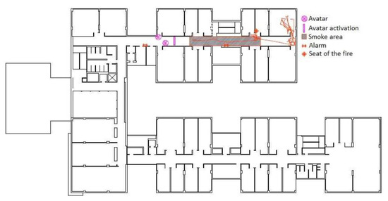 In this step, the following parameters are defined: starting point of the fire, propagation of the fire according to interior design, building materials and passive protection (flames and smoke), minimum distance at which the smoke and flames affect the user and smoke stratification (this information can be provided by firefighters, the extinguishing coefficient for smoke, the opacity of the atmosphere is a consequence of the amount of solid particles in the air, which makes it difficult to see objects depending on how far away from the user they are), type of alarm and communication signals for users, type, frequency and volume of the fire alarm, alarm voice message (the alarm message must be set up to be effective, with a total duration of less than 30 s, divided into three phases: call to attention, reason for the call and information on what to do).