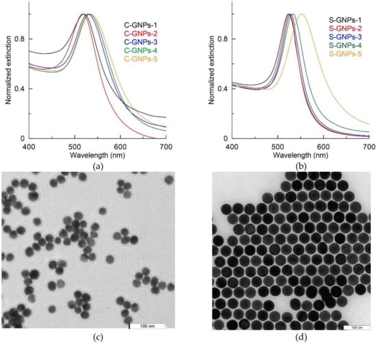 C-GNP and S-GNP series were synthesized with varied ratios of reactants (see Table 1 and Table 2) to reach different average nanoparticle diameters. In total, five C-GNPs and five S-GNP colloids were obtained. All of them were stable colloidal suspensions of red color, which is typical for nanodispersed gold. Figure 1a,b shows the colloid extinction spectra. For C-GNP, the position of the maximum extinction spectra depends on the amount of sodium citrate added during synthesis. It reached 518 nm for C-GNP-1, 520 nm for C-GNP-2, 527 nm for C-GNP-3, 532 nm for C-GNP-4, and 536 nm for C-GNP-5. The shift in the plasmonic peak to a longer wavelength range is indicative of a progressive increase in nanoparticle size. In the case of S-GNPs, extinction maximums reached values ranging from 522 to 563 nm, depending on the nanoparticle size. Note that the plasmonic peak of S-GNP had a lower width compared to C-GNP, which is indicative of higher sphericity and narrow size distribution. This observation was confirmed using TEM measurement (Figure 1c,d and Supporting Information, Figures S1 and S2).