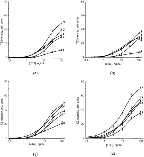 To choose the optimal conditions for LFIA, the obtained conjugates with adsorbed and cross-linked antibodies were used as labels, and the intensity of the test zone was measured as a function of the cTnI concentration. The obtained data are shown in Figure 2.