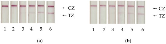 The assay was done at room temperature. The lower end of a test strip was dipped into an aliquot of the sample (70 μL) for 1 min and then placed on a horizontal surface. The result was checked within 10 min after sample application. The assaying of each sample was carried out in triplicate.