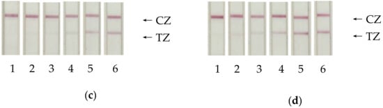 Images of test strips after immunochromatographic detection of cTnI at concentrations of 0.3 (1), 1 (2), 3 (3), 10 (4), 30 (5), and 100 (6) ng/mL. Panels (a,b) correspond to the conjugate C-GNPs-3 (33.7 nm)–IC4; (c,d) correspond to the conjugate S-GNPs-4 (64.5 nm)–IC4. Panels (a,c) correspond to adsorption immobilization of antibodies, (b,d) to covalent immobilization of antibodies. CZ: control zone, TZ: test zone.