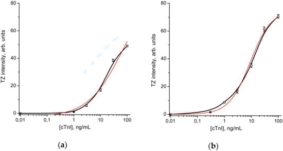 Dependence of the intensity of TZ staining on the concentration of cTnI in the sample was approximated (red line) by the function: y = (A − D)/(1 + (x/C)B) + D. For the conjugate C-GNPs-3 (33.7 nm)–IC4 with adsorption immobilization of antibodies (a) A = 0.07, D = 49.15, C = 23.0, and B = 2.62; for the conjugate sGNPs-4 (64.5 nm)–IC4 with covalent immobilization of antibodies (b), A = 0.04, D = 75.0, C = 8.98, and B = 1.11. All measurements were performed in triplicate.