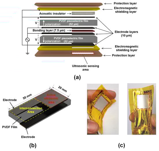 The uniformity of the thickness of the silver ink electrode layer was measured 10 ± 1 µm within the active ultrasonic area. The two pieces of the PVDF films were arranged in antiparallel polarization direction and bonded at the inner electrode layers by using a low-viscosity epoxy of 7.5 µm as a bonding layer. Considerations were taken to ensure the uniformity of the epoxy thickness and eliminating the trapped air microbubbles. Both the top and bottom outer electrode layers, next to the acoustic insulator layer and the ultrasonic sensing area, respectively, were connected to the ground electrical terminal. The inner electrode layers, between the two PVDF films, were bonded together and connected to the active voltage source terminal. Thus, the two PVDF films were connected electrically in parallel and acoustically in series with their piezoelectric polarization directions antiparallel. The double-layer PVDF films configuration reduces the input electrical impedance of the sensor, which consequently increases the intensity of the output ultrasonic wave from the available driving voltage source [102]. A flexible brass film for electromagnetic shielding to reduce the environmental noises and a polyimide film for WUS structure protection and electrical insulation were applied to wrap the entire structure of WUS except for the ultrasonic sensing area where the ultrasound is transmitted or received. The electromagnetic shielding and protection layers were removed from the ultrasonic sensing area in order to avoid the ultrasonic attenuation and reflection within these layers. At the backside of the double-layer PVDF films, a piece of paper as an acoustic insulator layer was inserted without bonding between the electromagnetic shielding and the electrode layers. Thus, the WUS was air-backed to eliminate the ultrasonic backward reflection, reduce the sensor thickness, and to improve the electromechanical performance. The developed WUS dimensions were 50 mm × 24 mm with a total thickness of 350 µm. The area of the ultrasonic sensing area was 20 mm × 20 mm. Figure 1c shows photos of the constructed WUS used in this study.