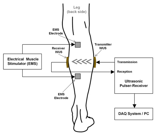 Figure 3 shows the schematic diagram of the ultrasonic measurement configuration to monitor the electrically evoked GC muscle contraction. The contractions of the GC muscle were evoked by an EMS device (Model: EMS 7500, Compass Health, Middleburg Heights, OH, USA) at EMS frequencies of 2, 6, 8, 10, 12 and 30 Hz with an electric pulse width of 300 µs. The amplitude of the stimulation pulse was adjusted to the comfort level of the human subject depending on the EMS frequency employed.