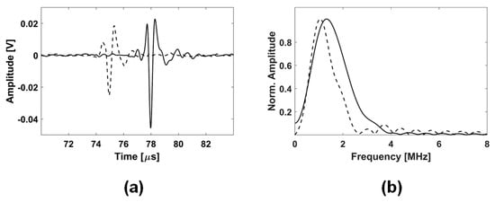 The received ultrasonic radio-frequency (RF) signals using the developed WUSs in the TT mode (a) and their frequency spectra (b). The dashed line indicates a relaxed state of the GC muscle, where the solid line indicates a contracted state.