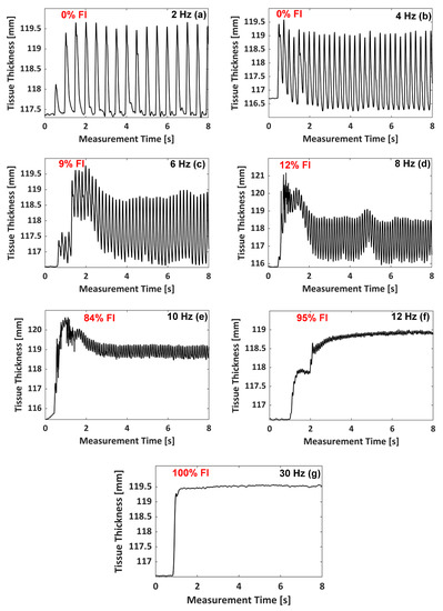 Figure 5 shows the changes in tissue thickness obtained during the evoked GC muscle contraction by the EMS at different EMS frequencies. The periodical change of the tissue thickness corresponding to EMS frequency was clearly observed from the GC muscle contraction at the EMS frequency from 2 to 12 Hz. At the EMS frequencies of 2 and 4 Hz, the GC muscle was able to relax completely between the intervals of two consecutive twitches. However, the partial relaxations between the consecutive twitches were seen at the EMS frequencies of 6 to 12 Hz, indicating the progression of tetanic contraction of the GC muscle. No relaxation was observed at the EMS frequency of 30 Hz under our experimental conditions. From the monitored thickness changes at each EMS frequency, the tetanic contraction progression level can be quantified using a fusion index (FI) [110,111,112]. The FI is defined (in %) by: