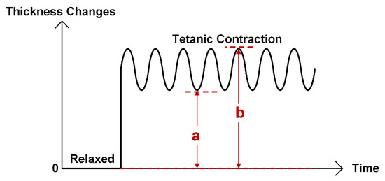 where a is the difference between the initial thickness (before the EMS applied) and the minimal thickness during the contraction, whereas b is the difference between the initial thickness and the maximal thickness during contraction, as illustrated in Figure 6. Thus, the FI of 0% means the twitch contraction with complete relaxation of the muscle, and that of 100% means the completely fused tetanic contraction.