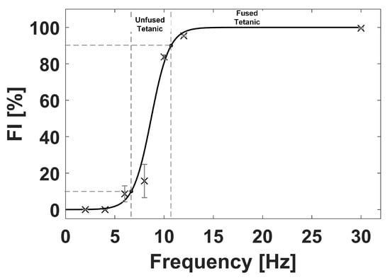 The FI value at each EMS frequency was obtained by taking the average of the calculated FI values between each electrical stimulation interval, after two seconds of initiating the EMS. Figure 7 presents the FI value, denoted by the cross mark, with the standard deviation (SD), denoted by the error bar, obtained at each EMS frequency. As seen in Figure 5a,b at the EMS frequencies of 2 and 4 Hz, respectively, the GC muscle had a complete relaxation between the consecutive stimuli, which indicates the FI of 0%. As the EMS frequency increased to 6 Hz and 8 Hz, the muscle would progress a partial relaxation represented by the FI values of 8.6 ± 4.4% and 15.7 ± 9.1% (mean ± SD), respectively. At 10 and 12 Hz, the tetanic contraction progressed further, and the FI values became 83.8 ± 1.2% and 95.3 ± 0.5%, respectively. The FI value of 100% was assigned at 30 Hz since no muscular relaxation between the consecutive stimuli was observed at 30 Hz, as shown in Figure 5g. In general, the unfused and fused tetanus is considered at FI value greater than 10% and 90%, respectively [113]. Therefore, based on the S-shaped (sigmoid function) curve fitting (solid line) of the obtained FI-EMS frequency relationships shown in Figure 7, the minimum stimulation frequencies necessary to evoke the unfused and fused tetanus were given at FI values of 10% and 90%, respectively, Thus, the GC muscle would be evoked to the unfused and fused tetanic contraction at EMS frequencies of 6.7 and 10.7 Hz, respectively, under our experimental conditions employed.