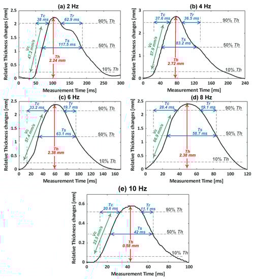 The monitored muscle contractions of the GC muscle were further analyzed by extracting the contractile parameters from a single twitch contraction such as maximum thickness changes, , contraction time, , contraction velocity, , sustain time, , and half-relaxation time, [9,15]. Figure 8 shows the extraction of the contractile parameters from a chosen single contraction twitch of the monitored GC muscle at each EMS frequency in the range from 2 to 10 Hz, which were not fused tetanus state in our experiments. At the EMS frequency of 2 Hz, the was 2.24 mm from the relaxed state to the maximum contracted state. The during which the thickness increased from 10% to 90% of the was 38 ms. During the , was 47.21 mm/s. The during which the GC muscle sustained the 50% of the was 117.5 ms. After reaching the maximum thickness, the thickness began to decrease, which indicates the relaxation period. The during which the thickness decreased from 90% to 50% of the was 62.9 ms. Table 1 lists the average contractile parameters obtained from the multiple twitches of the electrically evoked GC muscle contractions at each applied EMS frequency, shown in Figure 5. Averaging was taken from the twitches observed after the first two seconds of initiating the EMS, where the twitches became stables.