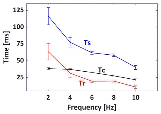 The values of , , and with respect to EMS frequencies from 2 to 10 Hz are presented in Figure 9. It was observed from these extracted contractile parameters that the contraction and relaxation periods of the GC muscle became shorter as the EMS frequency increase. As the EMS frequency increased from 2 to 10 Hz, the average values decreased from 38.25 to 21.62 ms, and the average values decreased from 63.49 to 10.80 ms. In addition, the GC muscle sustained a shorter contraction as the frequency progressed further, which was indicated by the average of 116.28 ms at 2 Hz compared to of 40.07 ms at 10 Hz.