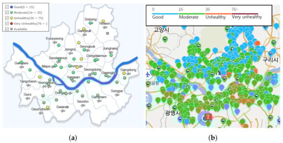 Comparison of deployment density by the responsible organization in Seoul. A circle indicates the location of equipment with Korea air quality index (AQI) of PM2.5. (a) By government (BAM); (b) By a company (Light-scattering) [].