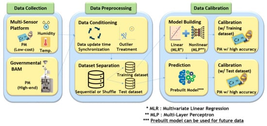 This section is written for describing the overall procedures of evaluation and calibration on low-cost sensors. It includes data collection (Section 2.1), data preprocessing (Section 2.2), data calibration methods (Section 2.3), and metric information (Section 2.4). Figure 2 shows the overall procedures for sensor evaluation and calibration. A multi-sensor platform has been developed and co-located with the governmental BAM in the government station (Dongjak-gu, Seoul, Korea) to evaluate low-cost light scattering PM2.5 sensor. The data have been collected for around 7.5 months (15 January 2019–4 September 2019). The following subsections will explain more information on several procedures we executed.
