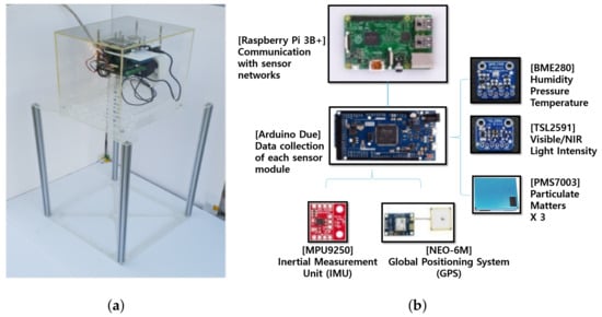 Three low-cost PM sensors are mounted on a single multi-sensor platform to identify sample variation among three low-cost sensor samples. It also includes environmental sensors of humidity, temperature, and ambient light to analyze and calibrate the environmental impact on the measurement of PM. Data collection of each sensor module in low level is performed through Arduino Due, and communication with sensor network in high level is implemented through Raspberry Pi 3B+, as shown in Figure 3b. Data are measured and stored at 1-s sampling intervals and configured to be transmitted to users via wired LAN or Wi-Fi.