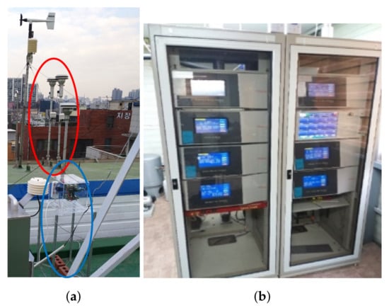 Information on governmental BAM station. (a) Outside; (b) Inside. It’s located at 6, Sadang-ro 16a-gil, Dongjak-gu, Seoul, Korea, and operated by the Seoul research institute of public health and environment. Inlets of BAM (red circle) and Multi-sensor platform (blue circle) are located together.