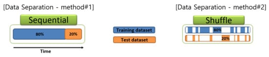 In this step, different data sampling intervals of two equipment were matched so that the data from the multi-sensor platform can be directly compared with the data from the governmental BAM. Data were excluded from data preprocessing if any intermittent data were observed from sensor modules. The data of the multi-sensor platform was averaged with a 5-min. fixed window. The preconditioned data were used to build the linear/non-linear calibration model, such as MLR, MLP, and SMART calibration, and to perform the actual calibration with the prebuilt model in the next step. To build and evaluate the calibration model, the dataset was constructed in two ways for comparison, as shown in Figure 5. One is sampling in a sequential manner (hereinafter sequential) and the other is a random manner (hereinafter shuffled) under various separating ratio (unless otherwise stated, 80% of the total datasets were randomly selected to construct a training dataset and the remaining 20% was used as a test dataset). Data preprocessing was done via Matlab R2018b [] and Python 3. Pandas [], the state-of-the-art Python data manipulation library, was also utilized for data preprocessing.