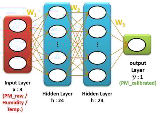 Non-linear calibration was performed based on a multilayer perceptron (MLP) from the neural network and it consists of an input layer, an output layer, and hidden layers. The calibration is performed by making an appropriate sum of weights between neurons existing in each layer, as shown in Figure 6. The sum of each weight passes a non-linear activation function, rectified linear unit (ReLU), to generate a non-linear model. ReLU activation is explained in Equation (2). PM2.5 (low-cost sensor), humidity, and temperature from the multi-sensor platform were preprocessed and used as input variables in the input layer. PM2.5 (BAM) from the governmental station was used as output variables in the output layer. Hyperparameters were manually chosen under several trials, as shown in Table 2.
