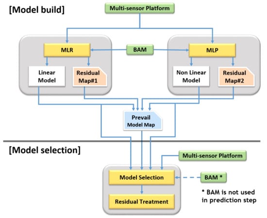 Each model has its “weak spot” in their domain due to the above nature of the linear/non-linear calibration models. For instance, LR has its weak spot in the non-linear region of the domain, and MLP has weak spot in the overfitted region. The SMART calibration method has been developed to improve this limitation. Figure 7 shows the overall procedures of model build and model selection. Firstly, two training models and residual maps are generated with training dataset in model build step. Secondly, a prevailing model map is constructed by comparing residual maps. Subsequently, the prevailing model map can be utilized in the model selection step.
