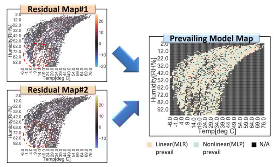 Residual maps and a prevailing model map for SMART calibration. Residual map#1 from the linear model (top left) and residual map#2 from the nonlinear model (bottom left) are merged into a prevailing model map (right). Residuals under high humidity and low-temperature condition are indicated in red dotted circles. In this region, the linear model has higher expectations of residuals than the nonlinear model.
