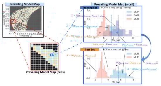 In more detail, the residual map that divides a full range of explanatory variable space (e.g., temperature and humidity) into segmented small area cells is generated, as shown in Figure 8. Every residual of training data is allocated to a corresponding partitioned cell of residual maps. The distribution of residuals in each cell of a residual map are assumed as a Gaussian, since residual is the error of the estimator. Each cell has its probability density function (PDF), which is expressed by its average and standard deviation. This information is stored in residual maps. For each cell, a prevailing calibration model is defined by comparing the residual maps of the linear and non-linear models. Every prevailing calibration model of each cell is stored in a prevailing model map. Once a prevailing model map is completed through a whole training dataset, the corresponding input cell of test dataset calibrates their data with a predefined suitable model and averaged residual, as shown in Figure 9 (Procedures of SMART calibration are further described in Appendix D). Figure 7, Figure 8 and Figure 9 are examples of explanations and the number and type of calibration models are not limited in MLR and MLP. SMART calibration has good features on the simpleness of procedures and the compatibility of several models since it is the hierarchical calibration model. As it depends on the consistency of estimators, the number of data in each cell is increased when the accuracy of SMART calibration is increased. Additionally, it has good performance with a high bias model, but it cannot outperform when SMART has only high variance models, since SMART calibration selects model according to variance of data in segmented cell.