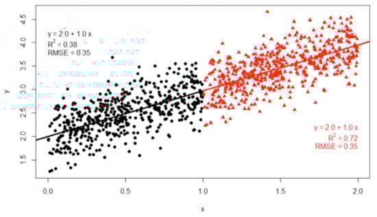 A characteristic of R according to widen data range. The black dot alone has R = 0.38, while the black dot and red triangle have R = 0.72. However, their regression line and RMSE are the same (Figure quoted []). This descriptive statistic is also required when R is used as a metric.