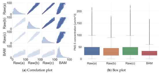 R of low-cost sensors with BAM was expressed as 0.416, 0.546, and 0.417. However, R among low-cost sensors expressed a very strong positive correlation coefficient, with 0.937, 0.994, and 0.933. It is possible to expect the effectiveness of the performance improvement via the calibration due to a very strong correlation coefficient with BAM output. Additionally, high R among the low-cost sensors in the commonplace indicates that a common calibration model can be shared under logged condition. The data distribution expresses the overall difference between the low-cost sensor and the BAM, as shown in Figure 11. The reproducibility among the low-cost sensors looked high with a very tight output span, but the reproducibility between the low-cost sensors with the BAM output looked low with a wide output span.