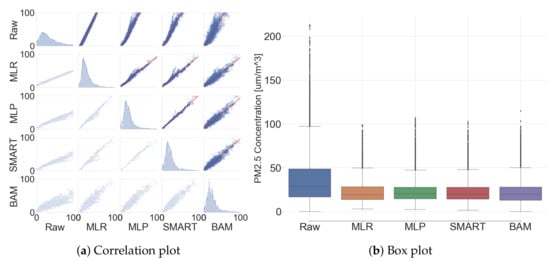 MLR, MLP, and SMART calibration were executed to evaluate the performance by following the methods in Section 2 with a PM sensor instead of three PM sensors. All of the described results from this subsection were only calculated by the test dataset, since the training dataset was used for calibration model generation. Figure 12 shows the correlation between low-cost sensors and BAM. Additionally, their correlation coefficient, evaluation metrics, and statistic summary are listed in Appendix B (Table A3 and Table A4).
