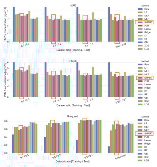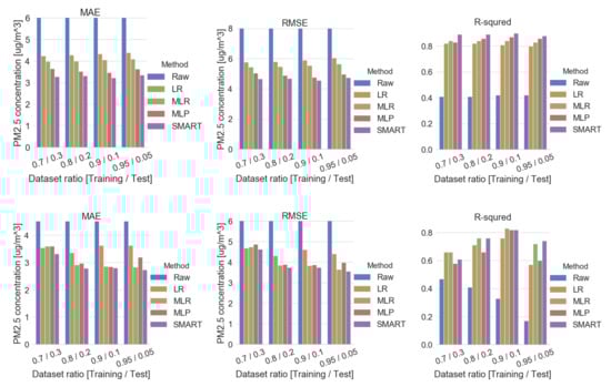 The means and standard deviations in g/m (raw signal), g/m (MLR), g/m (MLP), and g/m (SMART calibration) were obtained and compared with g/m (BAM). The normalized mean bias error declined from 65% to 1.7% and standard deviation decreased from 110% to 11.6% by applying MLP calibration models. R were observed as 0.41 (raw signal), 0.84 (MLR), 0.86 (MLP), and 0.89 (SMART calibration), respectively. By these results, the calibration significantly improves the performance of the low-cost sensors.