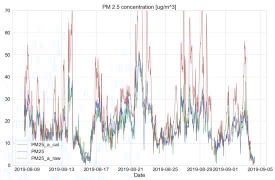 This calibration can also be applied to an upcoming future dataset with the previously generated calibration models under the sequential method. As an example, the sequential datasets from the raw signal, the SMART calibration signal, and the government BAM’s signal were plotted, as shown in Figure 14. For detailed information, a training dataset was constructed with the sequential condition from 15 January 2019 to 8 August 2019 and their calibration model was created. After that, the test dataset was built from 8 August 2019 to 4 September 2019 and the previously derived model from the training dataset was applied. As a result, the test dataset confirms a very similar BAM output (e.g., MAE = 2.79, MSE = 14.02, and R = 0.76).