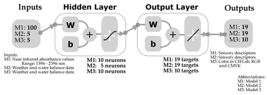 Three artificial neural network (ANN) regression models were developed using a Matlab® R2020a (Mathworks, Inc., Natick, MA, USA) code. A total of 17 different training algorithms were tested and compared (data not shown) to find the best models according to their performance, accuracy, and absence of overfitting signs. For Model 1, the raw absorbance values of 100 wavelengths within the 1596–2396 nm spectrum measured using the NIR device were used as inputs, while Model 2 was developed using the weather and water balance data mentioned in Section 2.2, both to predict the 19 sensory descriptors shown in Table 2. These models were constructed using the Levenberg Marquardt training algorithm with data divided randomly as 70% of samples used for training, 15% for validation with performance based on means squared error (MSE), and 15% for testing using a default derivative function (Figure 1). A neuron trimming exercise (Neurons: 3, 5, and 10) was conducted to find the best performance and no signs of overfitting.