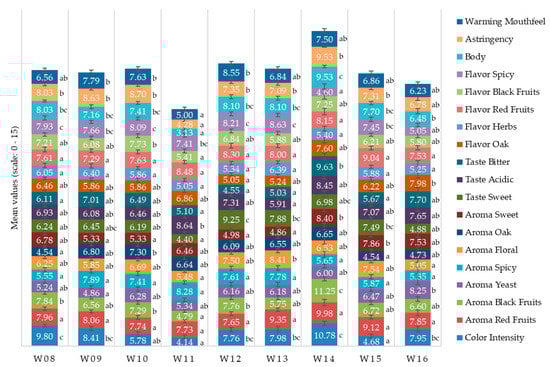 Figure 2 shows the ANOVA results for the sensory descriptors. Significant differences were found among samples for all descriptors. Sample W14 presented the highest intensity for descriptors such as color, red and black fruits aroma, sweet aroma, bitter taste, body, and astringency. At the same time, it had the lowest intensity in spicy flavor. On the other hand, W11 had the lowest intensity for color, black fruits aroma, sweet taste, herbs flavor, black fruits aroma, body, astringency, and warming mouthfeel. In contrast, it had the highest intensity for spicy aroma and acidic taste. The strongest warming mouthfeel, sweet taste, and bitterness were found in W12.