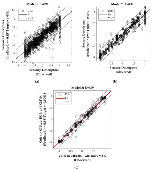 Graphs of the overall correlations for (a) Model 1 using near-infrared absorbance values used as inputs to predict sensory descriptors (Table 2), (b) Model 2 using weather information: (i) degree days from September to harvest (DD-S-H), (ii) maximum January temperature (MJT), (iii) mean maximum temperature from veraison to harvest (MeanMaxTV-H), and (iv) mean minimum temperature from veraison to harvest (MeanMinTV-H) plus (v) water balance as inputs to predict sensory descriptors (Table 2), and (c) Model 3 using weather and water balance data as inputs to predict color parameters in three scales (i) CIELab, (ii) RGB, and (iii) CMYK.