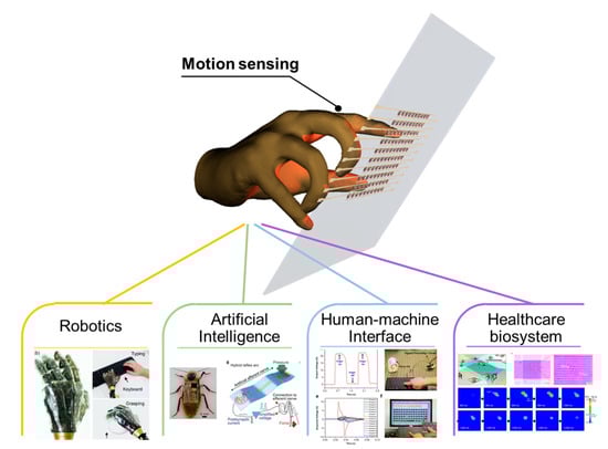 Human skin is one of the largest sensor networks that can detect various stimuli, such as pressure, temperature, strain, humidity, and pain. It also sends signals to the brain through synapses. E-skin is an electronic device that can mimic and reproduce these various characteristics of the human skin in materials, functions, and structures [110,111,112]. E-skin can be applied to robotics, and is highly useful for medical diagnostics when attached to the skin. It can also be applied to replacement prosthetic devices instead of injured skin and as a monitoring device that monitors physical condition in real time.