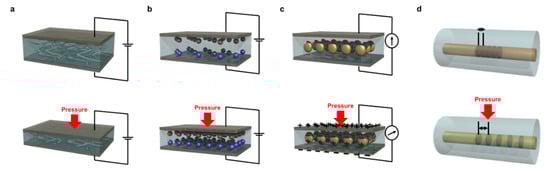 The transduction principle of a piezoresistive tactile sensor is to convert the change in the resistance of the device due to the application of external pressure into an electrical signal, with the current flowing mainly along the sensors. This mechanism is similar to that of a resistive tactile sensor, which utilizes change in contact resistance between two conductors upon physical force. These devices are fabricated from simple interlocked microstructures where physical deformation leads to change in contact resistance. Devices utilizing the piezoresistive principle have been studied in various forms and materials due to their excellent linearity, simple structure, method of operation, and the convenience of processing the output signal due to the facile mechanism [37,38,39,40]. Piezoresistive tactile sensors are suitable for measuring large pressure stimuli. These devices are mainly made using the complicated serpentine pattern of thin-film metal or the changes in the conducting path by three-dimensional percolation networks of one-dimensional or two-dimensional metal filler, such as metal nanoparticles and nanowires, within the elastomer matrix, inducing the resistance changes that are followed by current changes. Generally, compared to other types of devices, piezoresistive tactile sensors have fast response time and wide ranges in which they can detect pressure.