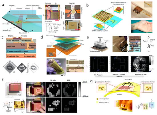 Field-effect transistor (FET)-based tactile sensor arrays with pressure-sensing components. (a) Active-matrix tactile pixel sensor comprising a switching transistor and a resistive touch sensor. (b) Thin conformal array pressure sensor made of elements of zirconate titanate (PZT) with transistor amplified pressure-sensing capability. (c) Tactile pressure sensor with pressure-sensitive component in its active-matrix transistor array. (d) Nanowire-based flexible tactile pressure sensor with pressure-sensitive rubber (PSR)-integrated active-matrix transistor array. (e) Tactile pressure sensor with carbon nanotube backplane integrated with active-matrix transistor array. (f) Nonvolatile tactile pressure sensor with active-matrix two-transistor array with intermediate pressure-sensitive rubber sheet. (g) Bifunctional sensor array with flexible ceramic polymer sensor laminated onto transistor backplane. (a) Reproduced with permission [80]. Copyright 2013, Springer Nature. (b) Reproduced with permission [79]. Copyright 2014, Springer Nature. (c) Reproduced with permission [62]. Copyright 2004, National Academy of Sciences. (d) Reproduced with permission [81]. Copyright 2010, Springer Nature. (e) Reproduced with permission [82]. Copyright 2015, John Wiley and Sons. (f) Reproduced with permission [84]. Copyright 2009, The American Association for the Advancement of Science. (g) Reproduced with permission [83]. Copyright 2009, Journal of Applied Physics.