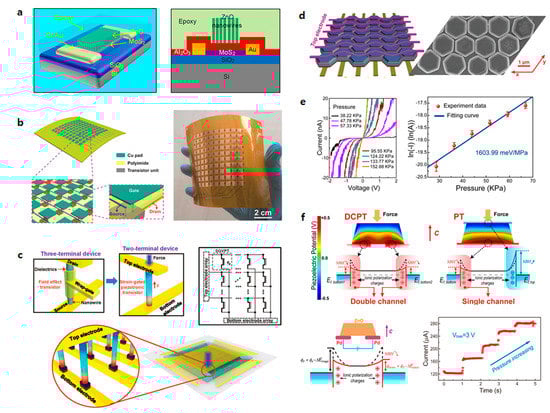 In general, transistors with pressure-sensitive channels use materials with piezoelectric or triboelectric properties. Piezoelectric or triboelectric materials are used in the form of strain-gated transistors. Chen et al. (2016) fabricated strain-gated field effect transistors using MoS2 and ZnO (Figure 5a) [86]. The transistor with ZnO nanowire placed over the channel makes the device pressure sensitive. When piezoelectric ZnO is pressed and polarization occurs inside, an electric field is generated as presented in other work [88]. Therefore, the drain current increases as the width of the channel increases. The pressure measurement was possible up to about 6.25 MPa. Yang et al. (2016) used triboelectric properties to fabricate a pressure sensor (Figure 5b) [89]. The device is called a tribotronic transistor array (TTA). Polytetrafluoroethylene was used as a mobile friction layer to induce charge upon contact with the electrode under pressure. The sensitivity of the device is 1.029/mm, and it can detect distances up to 9 mm based on the distance between the electrode and the polytetrafluoroethylene (PTFE).