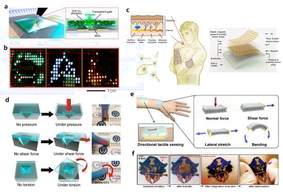 Recently, we fabricated tactile sensor arrays consisting of a mechanoluminescent layer and air-dielectric transistors. Cu-doped ZnS (ZnS:Cu) phosphor particles were used as mechanoluminescent (ML) components. When an external force is applied to the ML, light is emitted to the channel, and absorption of light causes a photocurrent to enable high pressure sensitivity in a wide detectable range of pressure as shown in Figure 7a [15]. The Ali Javey group demonstrated multimodal tactile sensors with active-matrix OLEDs for the first time. Outputs of applied pressures to tactile sensors are converted to human-readable information by active-matrix OLEDs. Red, green, and blue pixels comprise the OLEDs and emit light proportional to the intensity of applied pressure (Figure 7b). Pressure-sensitive rubber (PSR) is laminated on the top of the OLEDs, and its conductivity increases by applied forces [64]. In addition, Someya and co-workers made pressure- and thermal-sensitive sensors based on an organic semiconductor. By forming a net-shaped structure of a plastic film with organic transistor-based electronic circuits, conformability is possible [98]. Moreover, the Caofeng Pan group developed a polyimide-based 3D integration structure that allows simultaneous monitoring of seven physical stimuli and demonstrated stretchable multifunctional integrated sensor arrays in which each sensor can be driven independently without crosstalk (Figure 7c) [99]. E. Hwang and co-workers made flexible tactile sensors using polyimide and PDMS. The thin metal strain gauge incorporated in the polymer is used to measure normal and shear force. Each unit tactile sensor in 8 × 8 tactile sensor arrays evaluates deformations for normal and shear forces. In addition, the sensors have been proposed to measure ground reaction force because of their rigid structures [100]. D. Choi and co-workers used a pyramid-plug structure to detect normal force, shear force, and torsion. By utilizing pyramid-shaped engraved electrodes and ionic gel as neural mechanoreceptors, each mechanical force has its own deformation mechanism, as shown in Figure 7d [101]. Similarly, J. Park et al. developed stress-direction-sensitive, stretchable e-skin inspired from interlocked microstructures found in epidermal-dermal ridges in human skin. Microdome arrays employed for e-skin have a highly sensitive detection capability for various mechanical stimuli, such as normal, shear, stretching, bending, and twisting forces (Figure 7e) [102]. For commercialization of multimodal, multifunctional tactile sensors, the Rogers group proposed the fabrication of epidermal electronics using multimodal, multifunctional tactile sensors for the first time. Unlike basic wafer-based technology, conformal contact is possible using only Van der Waals force on curved skin. By attaching their devices to the back side of a commercial temporary transfer tattoo, they achieved multifunctional invisible epidermal electronic skins as shown in Figure 7f [103].