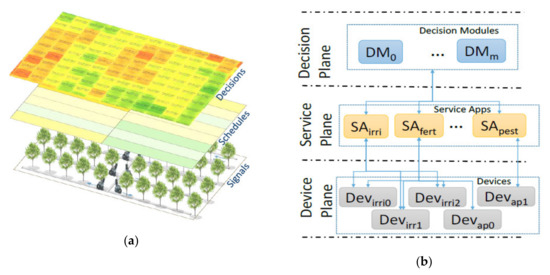 An innovative framework for a cloud-based decision support automation system (DSAS) in order to assist the orchards’ cultural practices was presented in [5], able to acquire data from different sources, to make specific decisions and control devices installed on the field. It has a modular software architecture, featured by decision modules arranged in a hierarchical structure, handling the diversity of data by using a data model to specify the format, data types and enabled operations of input data set. Given the heterogeneity of possible cultural operations on the orchard, the cloud-based DSAS has an extendible and adaptive architecture, for adding a new decision module when required. In particular, the software follows the open/close principle, namely, it is open for any extensions, but close for modifications. The software-managed control was structured in three layers: (1) the decision layer defines the actions at a high level, (2) the service plane schedules the actions for each device, (3) the device layer performs the defined schedules (Figure 1).
